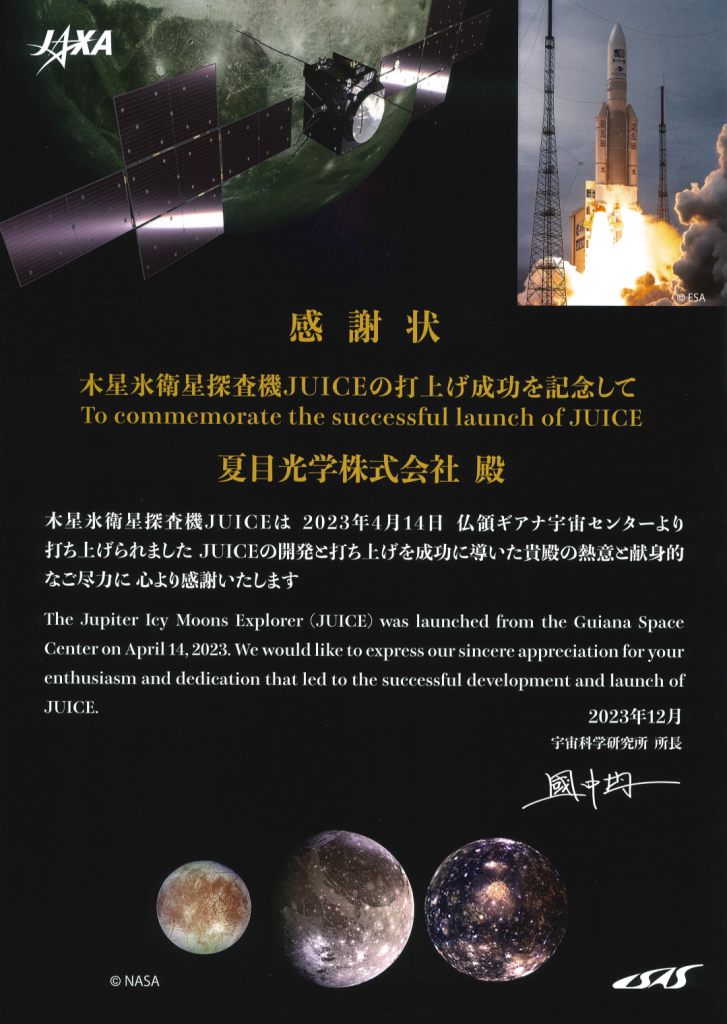 We are delighted to inform you that NATSUME OPTICAL CORPORATION (NATSUME) has received a letter of appreciation from the Japan Aerospace Exploration Agency (JAXA) to commemorate the successful launch of the Jupiter Icy Moons Explorer (JUICE).